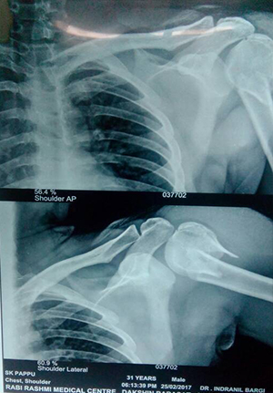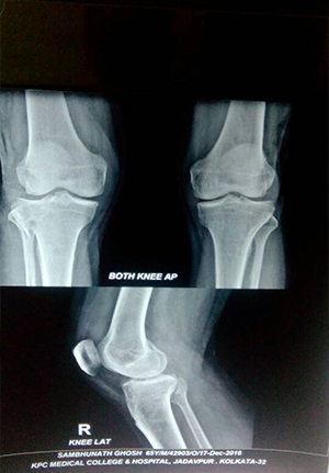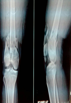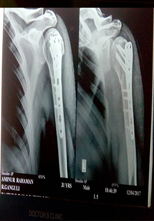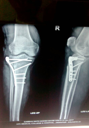 Pre and post op picture of comminuted fracture distal femur and patella in RTA