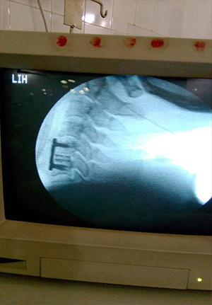 Post op picture of cervical spine fusion with cage and plate